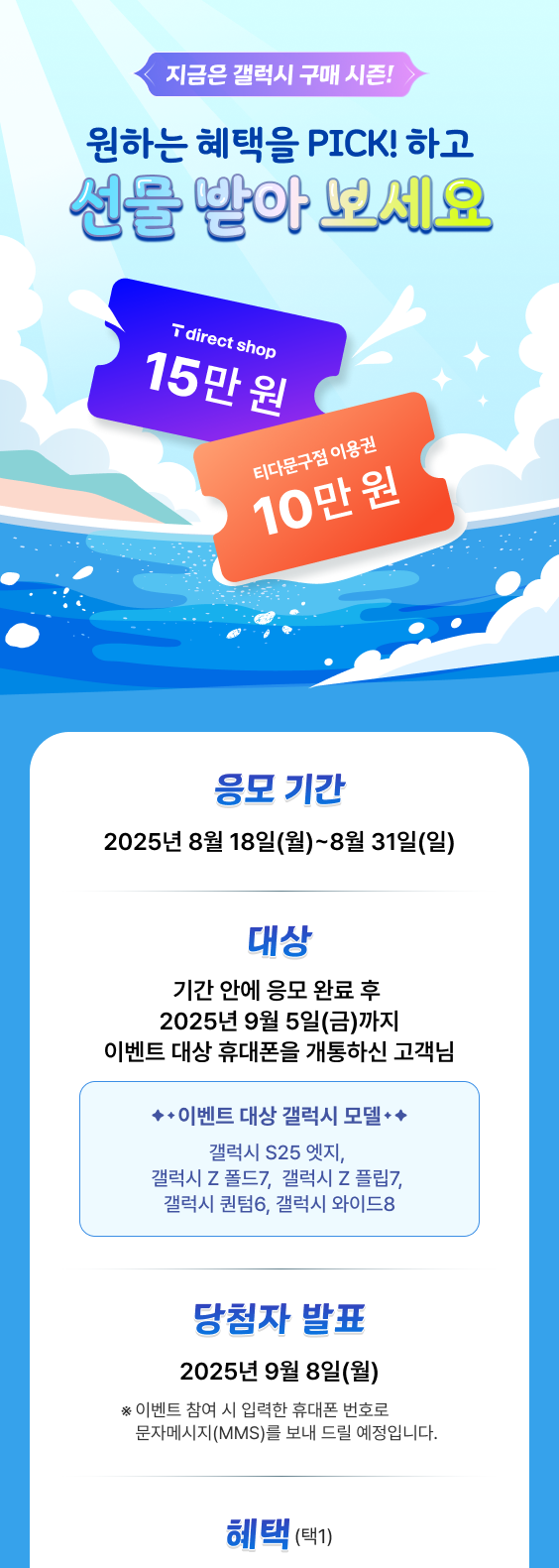 “8월 갤럭시 PICK 이벤트”와 관련하여, 본인의 개인정보를 SK텔레콤 주식회사가 수집 및 이용합니다.