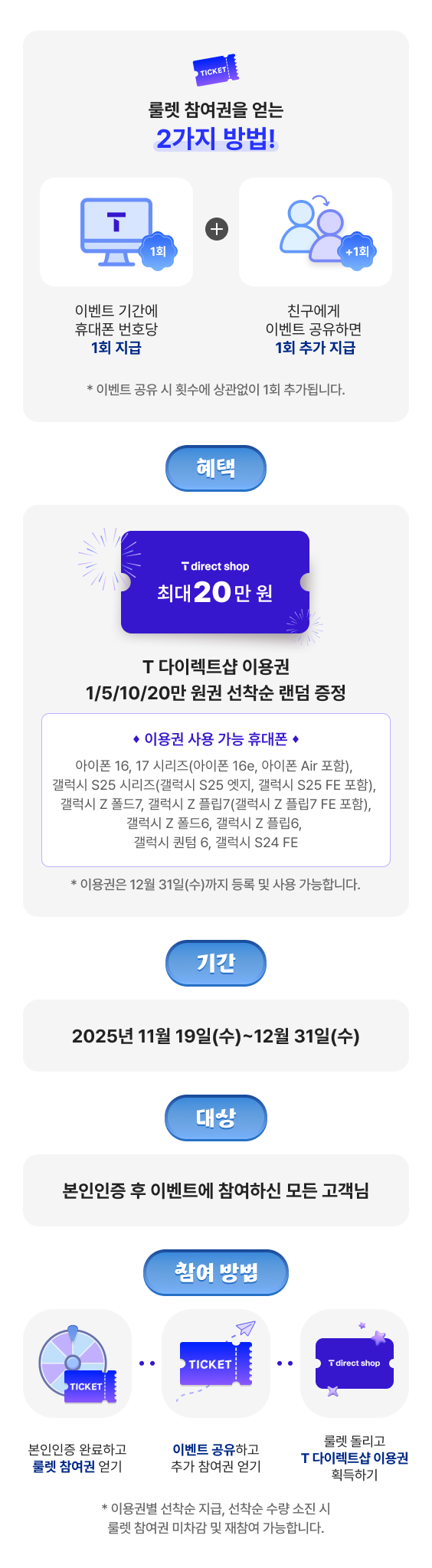 “T 다이렉트샵 행운의 룰렛 이벤트”와 관련하여, 응모자 본인이 만 14세 이상임을 확인합니다.
