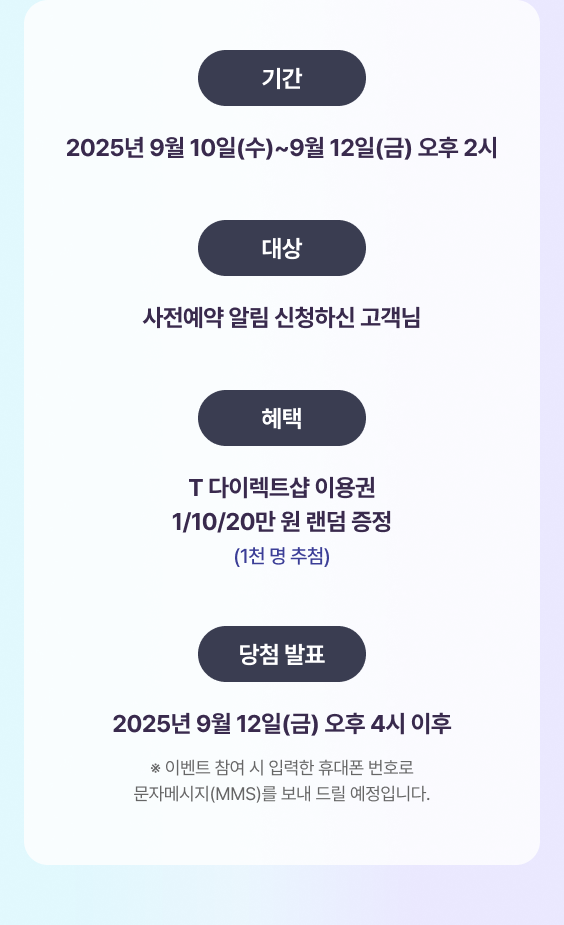 | T 다이렉트샵 광고 메시지(문자, 앱 푸시 등) 발신 및 전화 상담 | 통신사, 이름, 생년월일, 휴대폰 번호 | 이벤트 응모일로부터 24개월 동안 보관 후 파기 |